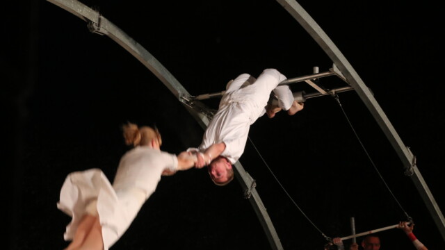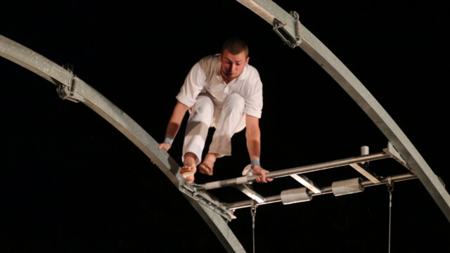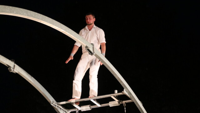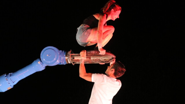 Nach Schwerte brachte UliK den Prototyp seines Roboters mit und zum letzten Mal die komplette Originalbesetzung. Unter dem Titel „RoboCircus“ vereinetn sie drei grundverschiedene Stücke. In allen geht es um die Interaktion der menschlichen Akteure mit der Maschine. Dabei wird der Roboter mehrfach umgebaut, um als Musikinstrument zu erklingen, sich als Dritter in ein artistisches Pas-De-Deux einzumischen oder als Akrobatik-Pole zu fungieren. Ein Rendezvous der ganz besonderen Art, bei dem die Zuschauer den Roboter nicht mehr als reine Maschine, sondern als einen unglaublich gefühlvollen, auch mal aufmüpfigen, aber immer liebevollen Partner im Spiel mit den Artisten erleben.