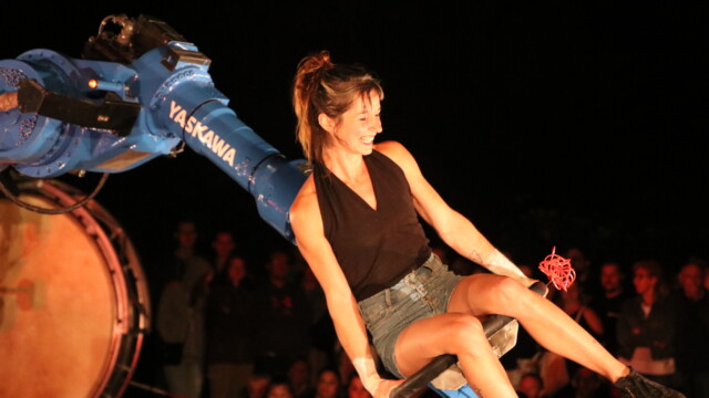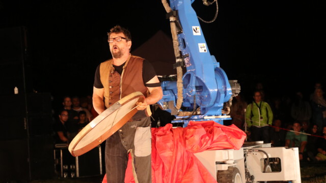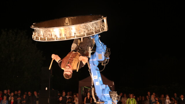 Der Höhepunkt des Abends: UliK Robotic mit RoboCircus. Vor einigen Jahren hat UliK, der Daniel Düsentrieb des Theaters im öffentlichen Raum, begonnen mit den Möglichkeiten eines von ihm umgebauten Industrie Roboters zu experimentieren. Ergebnis sind mehrere artistisch-theatrale Spektakel um das Zusammenspiel von Mensch und Maschine. Mit weltweitem Erfolg: Seine Produktion „RoboPole“ wurde im vergangenen Jahr auf dem renommierten Festival „Cirque de Demain“ in Paris ausgezeichnet und ist derzeit mit dem Zirkus Roncalli als Highlight der aktuellen Show auf Tournee. Ein weiteres Spektakel rund um die Begegnung von Roboter und Mensch entwickelte UliK dieses Jahr in Kanada für eine neue Großproduktion des „Cirque du Soleil“. Er selbst gastiert zusammen mit dem Roboter und der Show „DrumGod“ auf renommierten Festivals im In- und Ausland.
